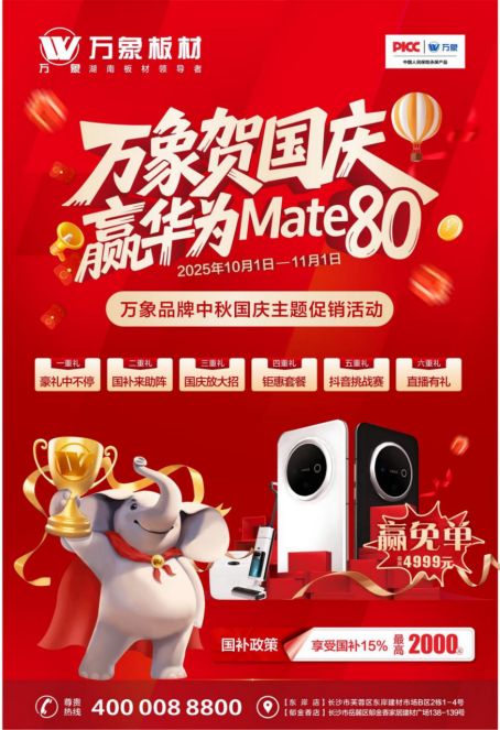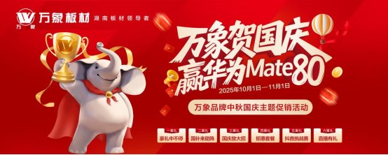 金秋十月,中秋國(guó)慶雙節(jié)疊加,家居消費(fèi)市場(chǎng)熱潮涌動(dòng),各品牌紛紛加碼營(yíng)銷釋放福利。在此競(jìng)爭(zhēng)格局下,旺德府集團(tuán)作為湖南家居建材領(lǐng)軍、全國(guó)行業(yè)的知名企業(yè),秉承“為千萬(wàn)客戶創(chuàng)享美好健康環(huán)境”的企業(yè)愿景,傾力整合旗下兩大核心品牌——萬(wàn)象板材與萬(wàn)象天冠高端衣柜定制,拿出滿滿誠(chéng)意讓利客戶!堅(jiān)守品質(zhì)初心,實(shí)力回饋客戶,于10月1日至11月1日開展“萬(wàn)象賀國(guó)慶 贏華為 Mate80” 雙節(jié)促銷活動(dòng),以“真品質(zhì)+真優(yōu)惠”為全國(guó)的消費(fèi)者朋友們打造綠色家居方案,彰顯頭部品牌責(zé)任與擔(dān)當(dāng)。