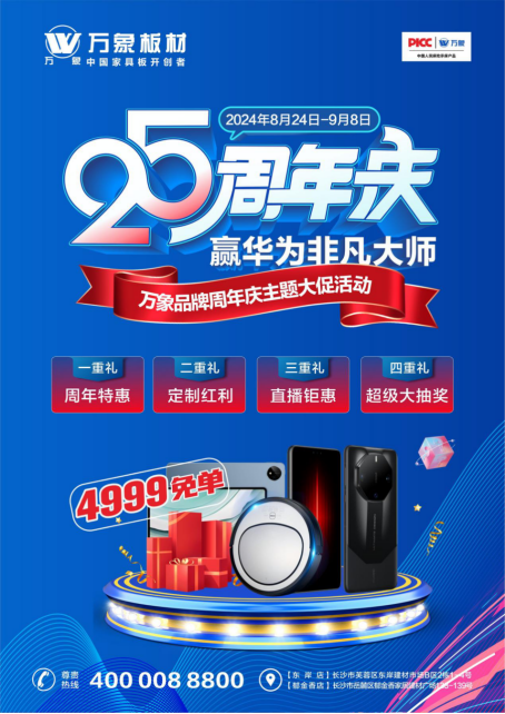 歲月悠悠,匠心筑夢。在這個碩果累累的美好時節(jié),萬象板材迎來了其輝煌歷程中的又一個重要里程碑——25周年慶典。值此25周年慶典之際,萬象板材心懷感恩,特推出“萬象25周年慶主題大促活動”,萬象板材精心準(zhǔn)備了一系列超值優(yōu)惠與精彩活動,誠邀您共襄盛舉。