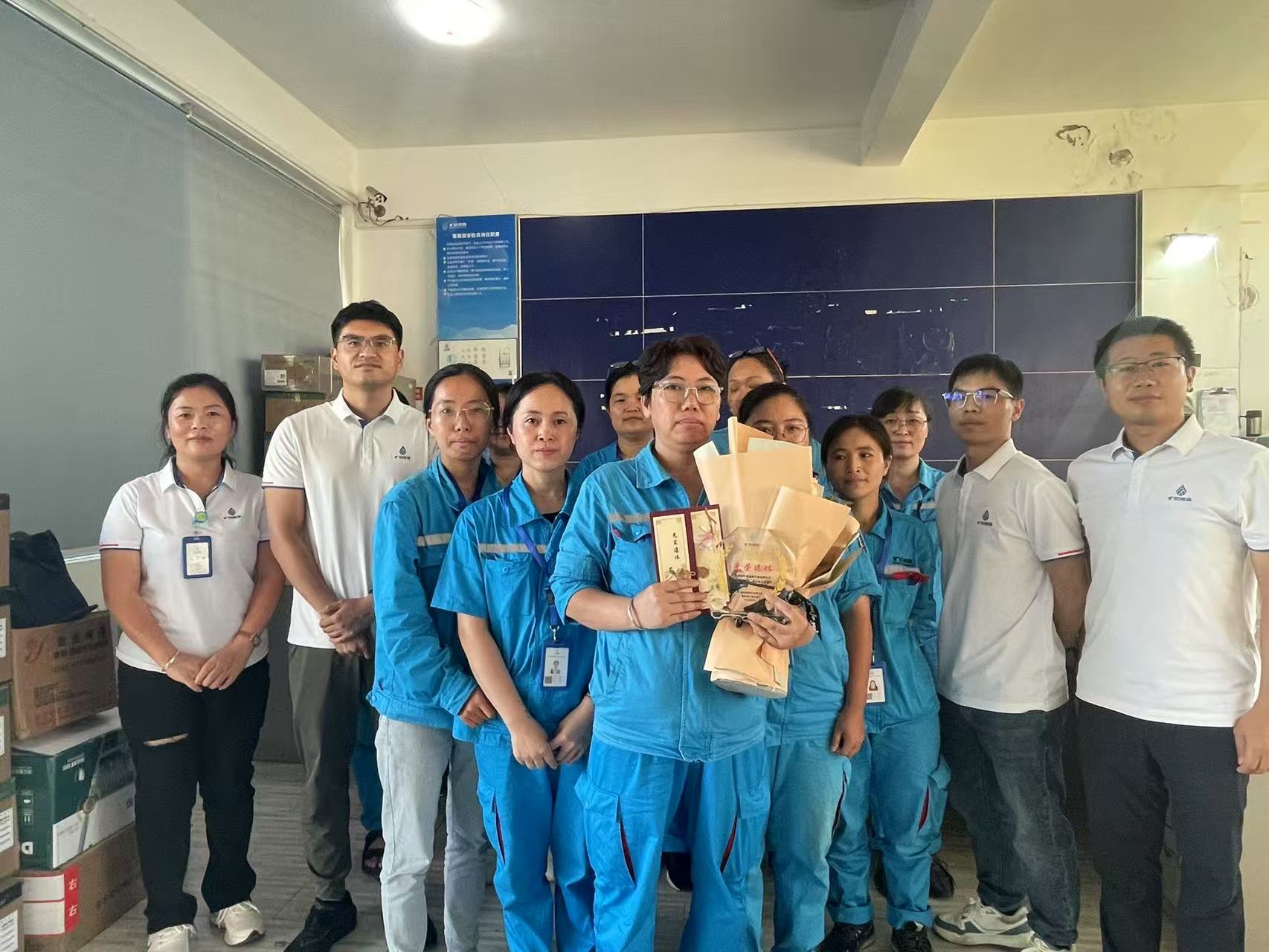 莆田燃?xì)馐聵I(yè)部副總陳濤濤、退休員工的部門負(fù)責(zé)人一起為兩位退休員工送上了帶向日葵的鮮花、印有 “光榮退休” 的蛋糕、帶有公司 logo 的水晶杯以及曠遠(yuǎn)能源副總裁兼莆田燃?xì)馐聵I(yè)部總經(jīng)理柯軍親筆簽名的感恩祝福賀卡。每一份禮物都飽含著公司對(duì)他們的深深敬意與誠(chéng)摯感謝。