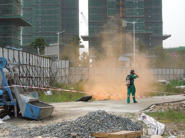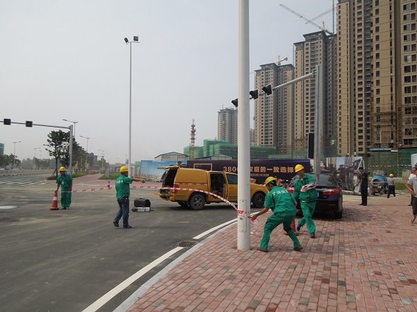 演練開始。首先,2652111搶險電話接到莆田市萬科城溪園小區(qū)(尚濟路)北側建工地的施工單位的報警。該單位因進行小區(qū)綠化平整工程建設的需要,動用挖掘機施工,卻因對管線位置的不熟悉而盲目操作,致使我司敷設在工地內(nèi)的De110預留中壓管被鏟斷,造成燃氣大量泄露,現(xiàn)場白霧彌漫,并發(fā)出較為強烈的氣流聲。公司管網(wǎng)部門接到報警后,立即將事故初步情況上報有關領導,并啟動公司緊急預案。緊接著,調(diào)控中心立即對事故搶險人員和突發(fā)事故應急處理各小組人員進行調(diào)度并協(xié)調(diào)宏盛市政工程公司做好搶修準備。我司調(diào)控中心亦配合客服部向用戶發(fā)布緊急停氣通知。接到通知后,各搶險和事故處理人員立即趕往事故現(xiàn)場。到達現(xiàn)場后,工作人員馬上疏散場外圍觀群眾,拉起警戒線,對有效區(qū)域隔離警戒;搶險人員佩戴安全設備進入事故現(xiàn)場,查找泄漏點,并及時對事故點進行搶修。各搶險和事故處理小組各司其職,相互配合,經(jīng)過多方搶修,事故最終得到解決。最后,總指揮指示客服部門向各小區(qū)用戶及物業(yè)管理發(fā)送短信通知恢復供氣,并通知人員撤離和解除緊急警報訊號。
