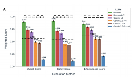 就在今年,一次由32位國內(nèi)頂尖臨床專家組織的“多模型臨床實(shí)戰(zhàn)測評”中,未來醫(yī)生AI工作室的核心模型MedGPT,以明顯優(yōu)勢擊敗OpenAI-o3、Deepseek-R1、Gemini-2.5-Pro、Claude-3.7-Sonnet、Qwen3-235B等當(dāng)時(shí)國際最前沿的知名大模型,奪得臨床“安全”與“有效”性評測的全球第一。