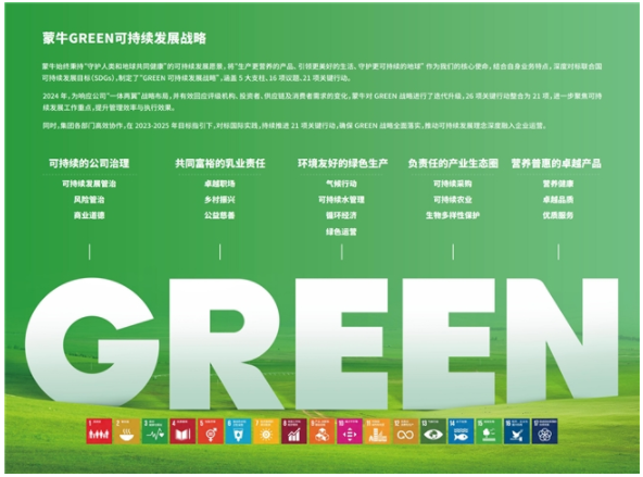2021年,蒙牛結(jié)合自身業(yè)務(wù)特點(diǎn),深度對標(biāo)聯(lián)合國可持續(xù)發(fā)展目標(biāo)(SDGs),制訂了“GREEN可持續(xù)發(fā)展戰(zhàn)略”——G是可持續(xù)的公司治理,R是共同富裕的乳業(yè)責(zé)任,E是環(huán)境友好的綠色生產(chǎn),第二個(gè)E是負(fù)責(zé)任的產(chǎn)業(yè)生態(tài)圈,N是營養(yǎng)普惠的卓越產(chǎn)品。