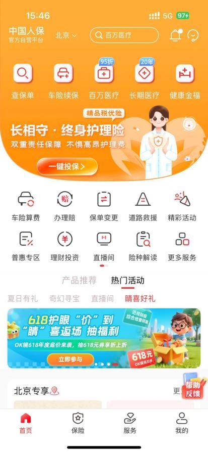 采用 “功能矩陣 + 輪播廣告 + 地區(qū)專(zhuān)享” 三層結(jié)構(gòu),車(chē)險(xiǎn)服務(wù)(算費(fèi)、續(xù)保、救援)置于金剛區(qū)首位,爆款產(chǎn)品(如百萬(wàn)醫(yī)療險(xiǎn))以輪播圖突出展示,下方 “熱門(mén)活動(dòng)” 板塊強(qiáng)化用戶互動(dòng)。
